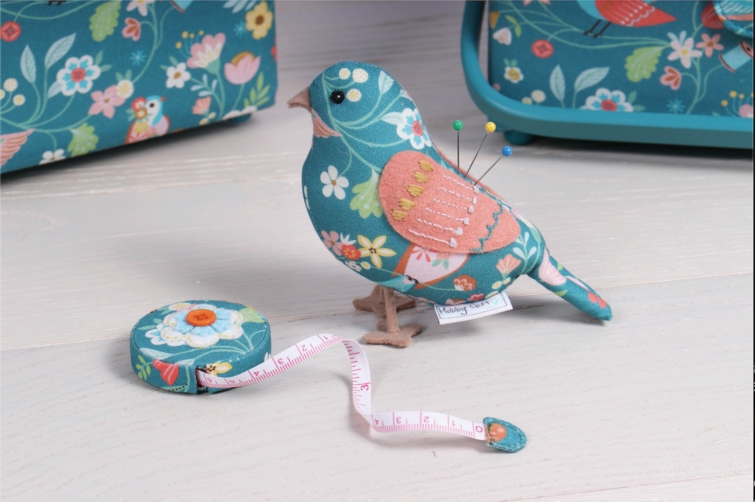 Novelty pincushion in the shape of a bird, made from cotton fabric. Spot clean only. Item size: (d/w/h) 5 x 13.5 x 10.5cm.