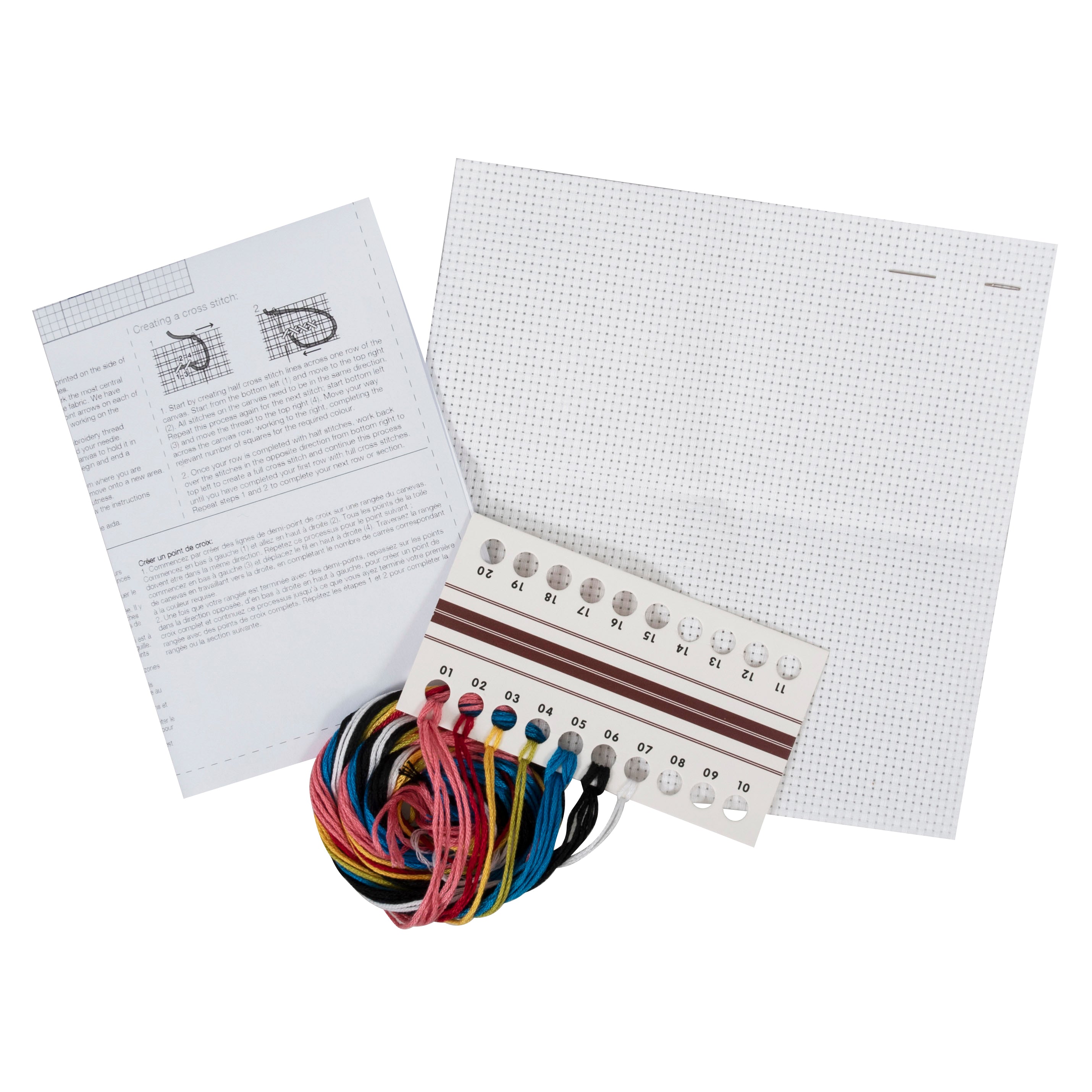 - Kit includes: white, cotton, 11 count aida fabric; 6 strand, polyester, embroidery thread; needle; printed colour coded design and instructions in 6 languages: (EN/FR/DE/ES/IT/NL).