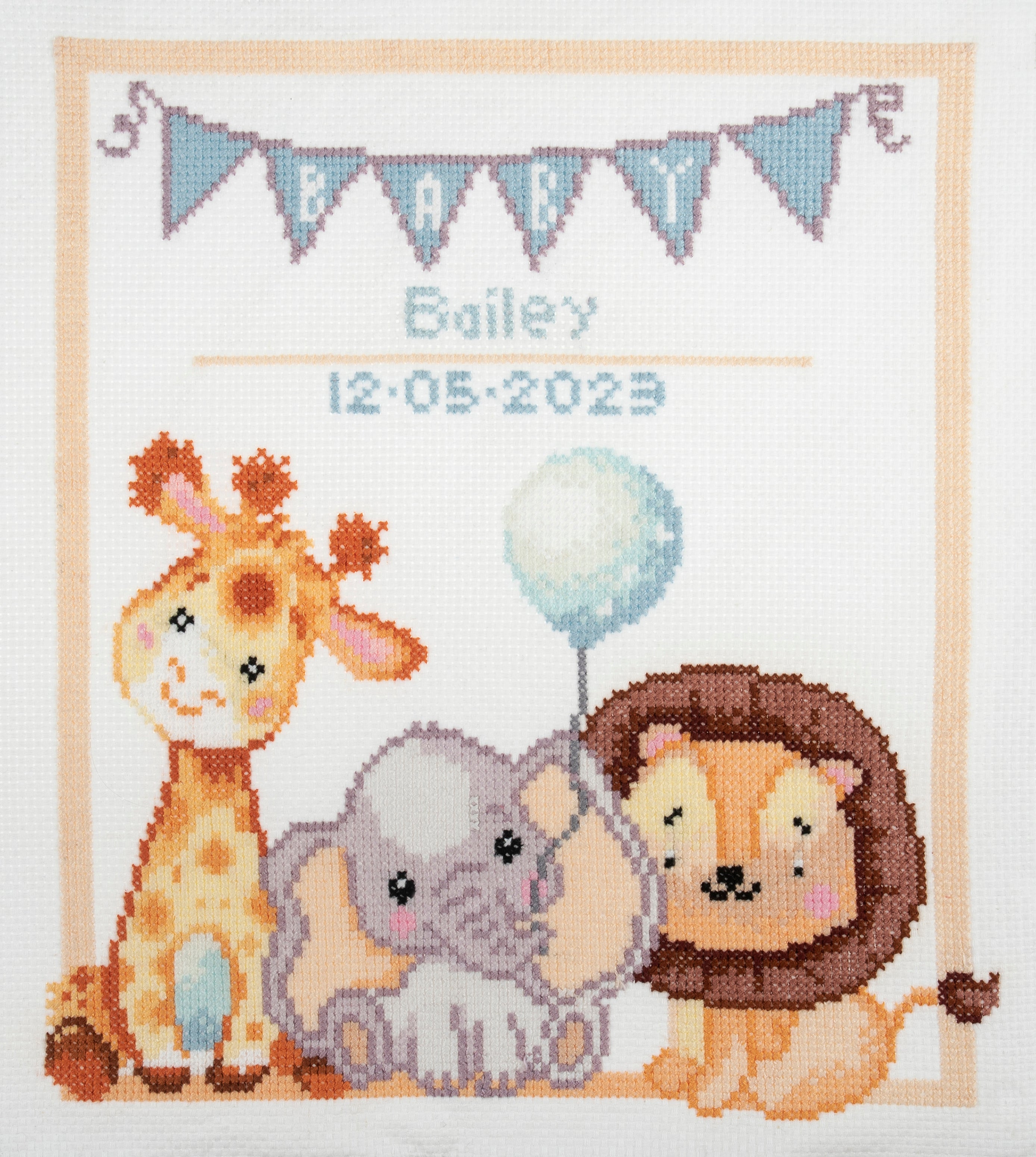 Counted cross stitch design. Kit includes: 11 count, white, cotton, aida fabric; pre-sorted, stranded, cotton thread; needle; printed colour coded design and easy to follow instructions in 3 languages (ENG, FR, GER). Approximate finished size: (w/h) 36 x 36cm. Hand wash in cold water. Do not tumble dry.