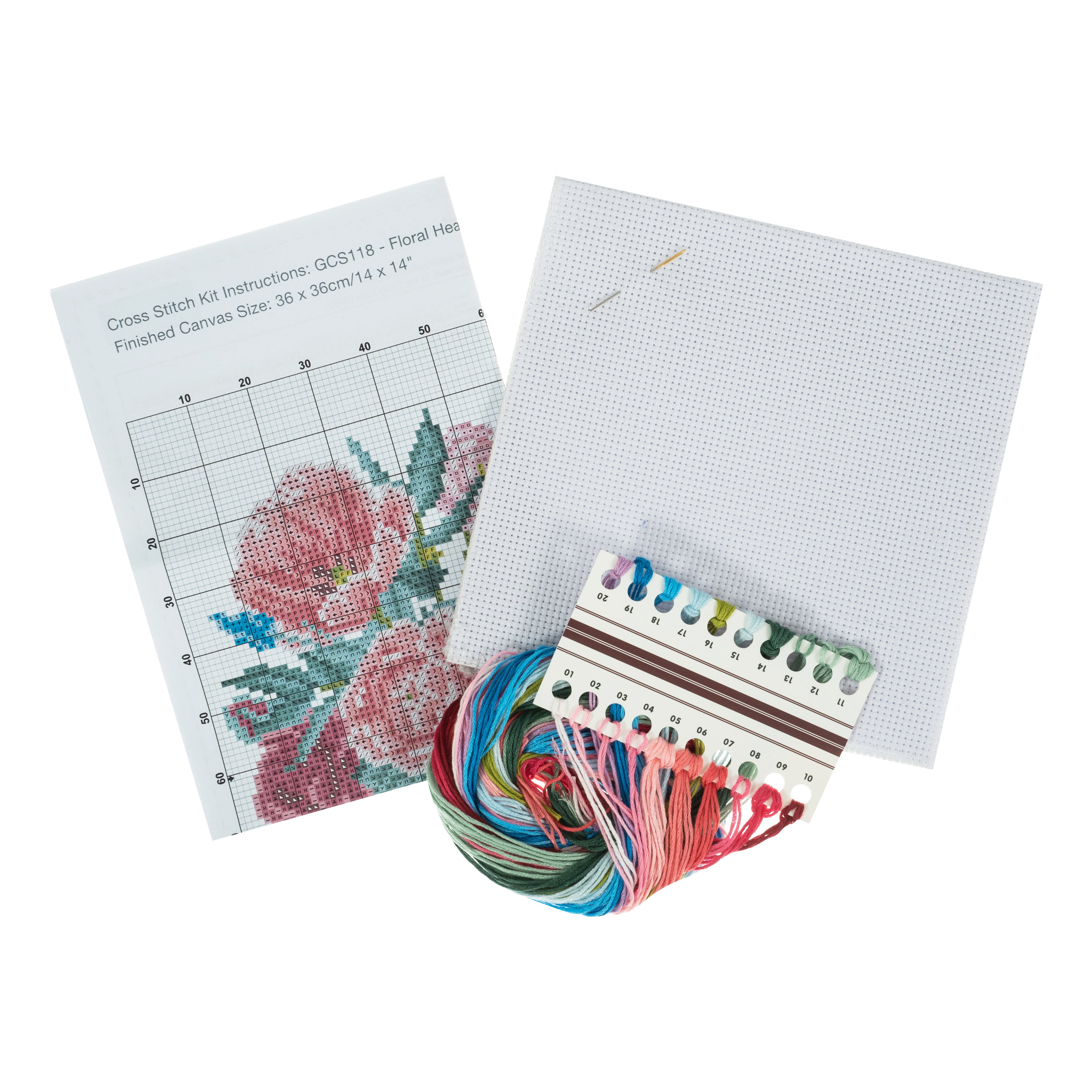 Counted cross stitch design. Kit includes: 11 count, white, cotton, aida fabric; pre-sorted, stranded, cotton thread; needle; printed colour coded design and easy to follow instructions in 3 languages (ENG, FR, GER). Size of fabric: (w/h) 36 x 36cm. Size of stitched design: (w/h) 28 x 28cm. Hand wash in cold water. Do not tumble dry.