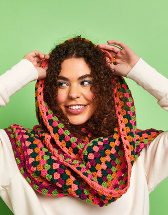 Introducing you to the crochet granny stripe in a giant colourful cowl that will turn any sweater into a style statement. Designed especially for beginners, this crochet kit includes everything you need to start your crochet journey with a fun simple project.