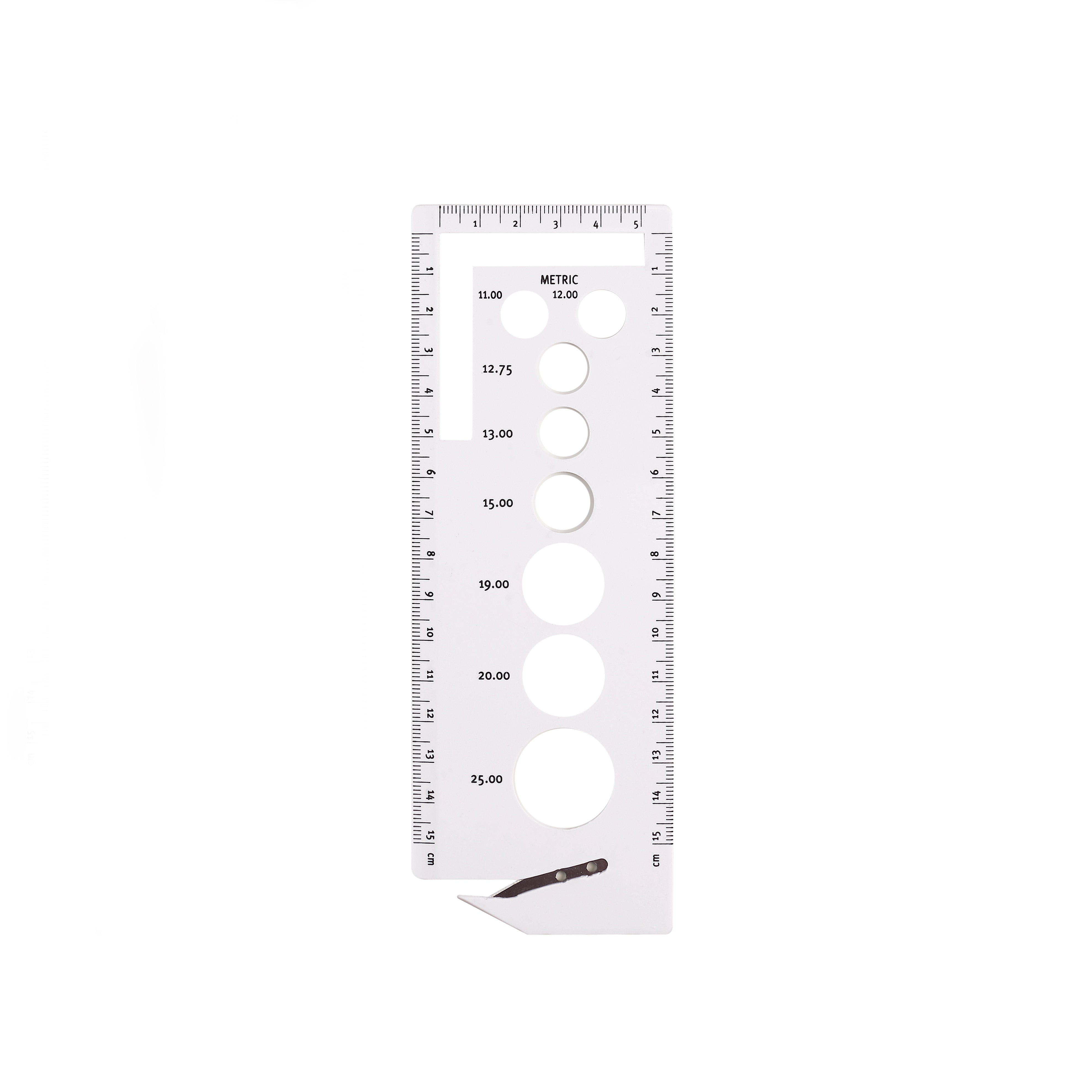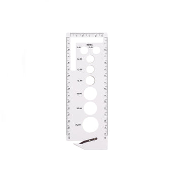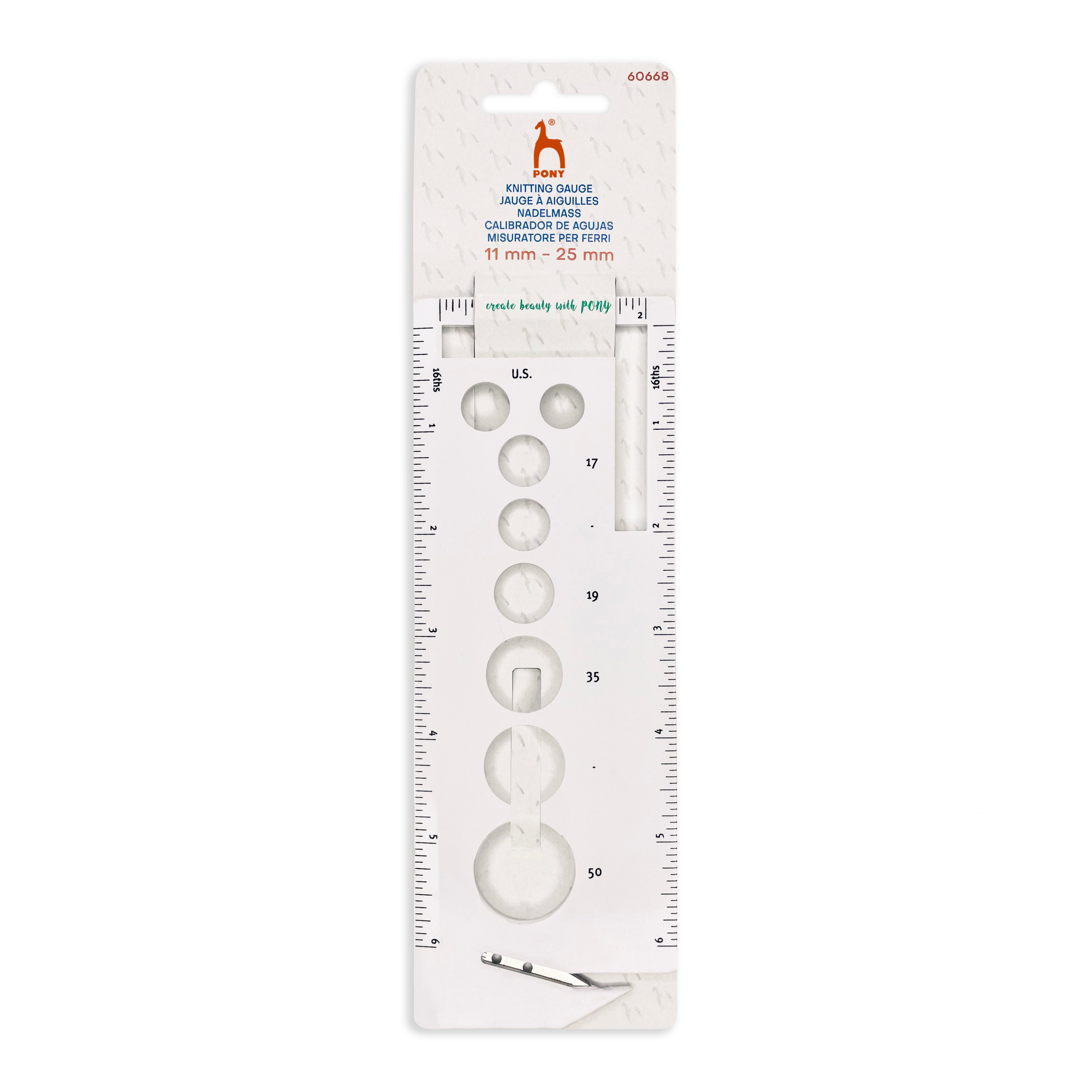 Pony's Large Knitting Gauge is perfect for measuring a wide range of bigger needle sizes, from a hefty 11.00mm to a giant 25.00mm, making it perfect for your bigger needles. While its primary function is to check needle sizes, this versatile gauge can also be used to measure tension squares and features a concealed blade at one end for cutting yarn – offering three tools in one! With metric measurements on one side and Imperial and US sizes on the opposite side, this compact tool is truly a must-have for all knitters.