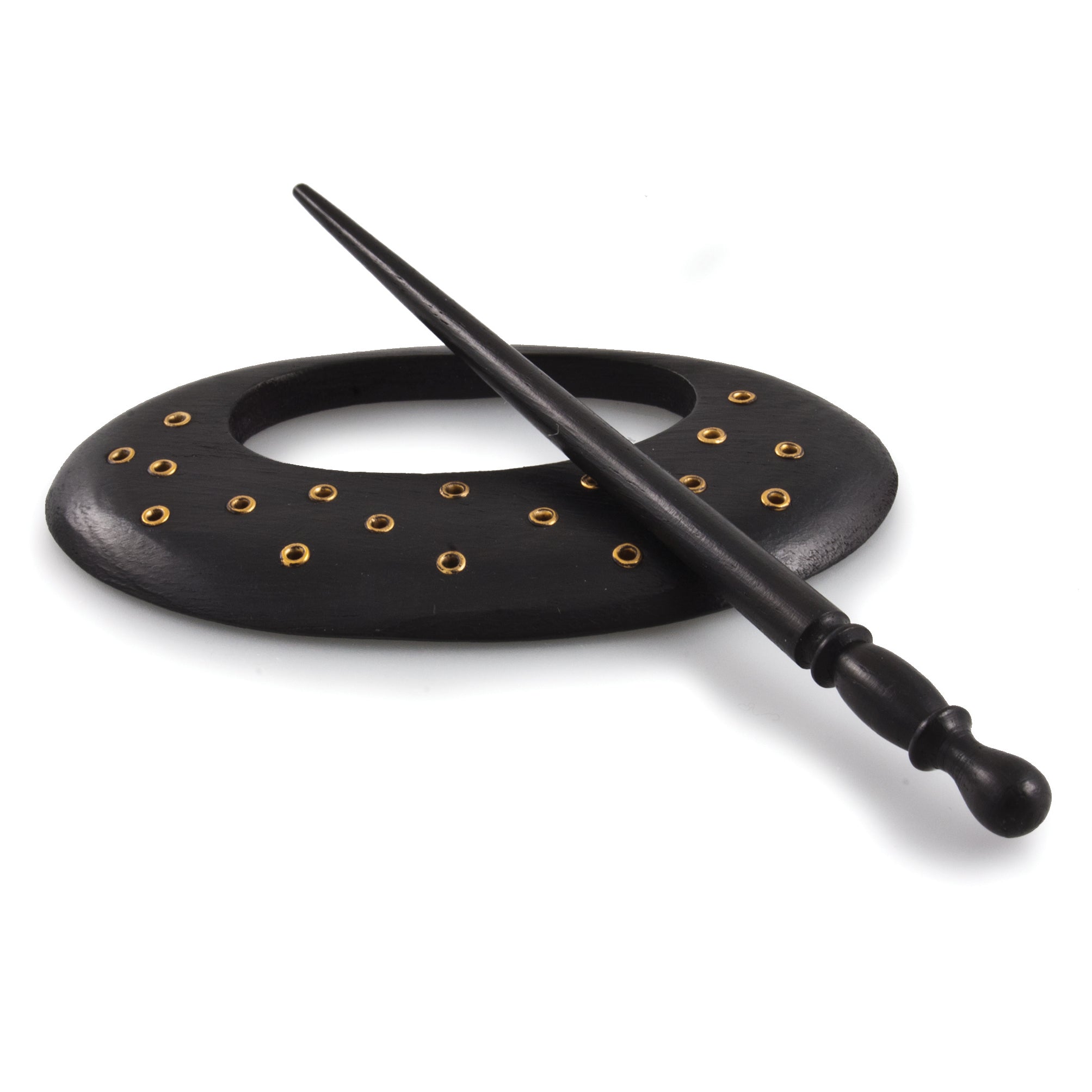The deep hue of this striking shawl pin is beautifully enhanced by the circular gold accents, arranged in a pleasingly consistent pattern that offsets the asymmetrical design. Paired with a sturdy yet minimalist shawl stick, this pin is ideal for those seeking a chic yet subtle accessory – it could be a perfect addition to your collection!