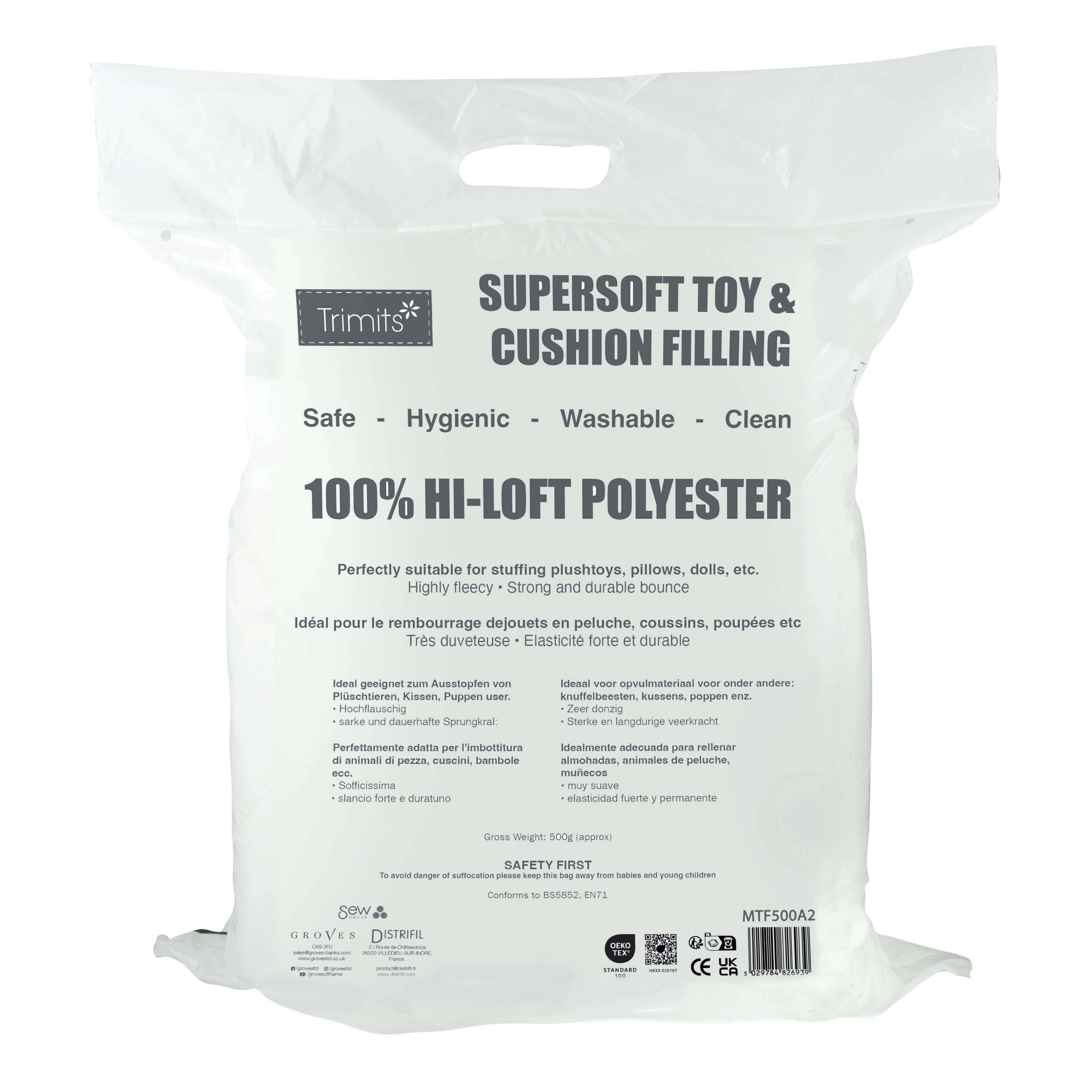500g bags of Trimits toy stuffing/filling at a promotional price. Filling for toys, cushions and all craft projects. Super soft, premium grade polyester fibre suitable for the most delicate and intricate of projects. Fibre complies to BS5852 British flammability test, BS1425 British cleanliness certificate & EN71-3 European standards certificate. All makers of craft gifts will need a record of the EN71-3 to display in their makers safety file as a legal requirement. OEKO-TEX Standard 100 certified.