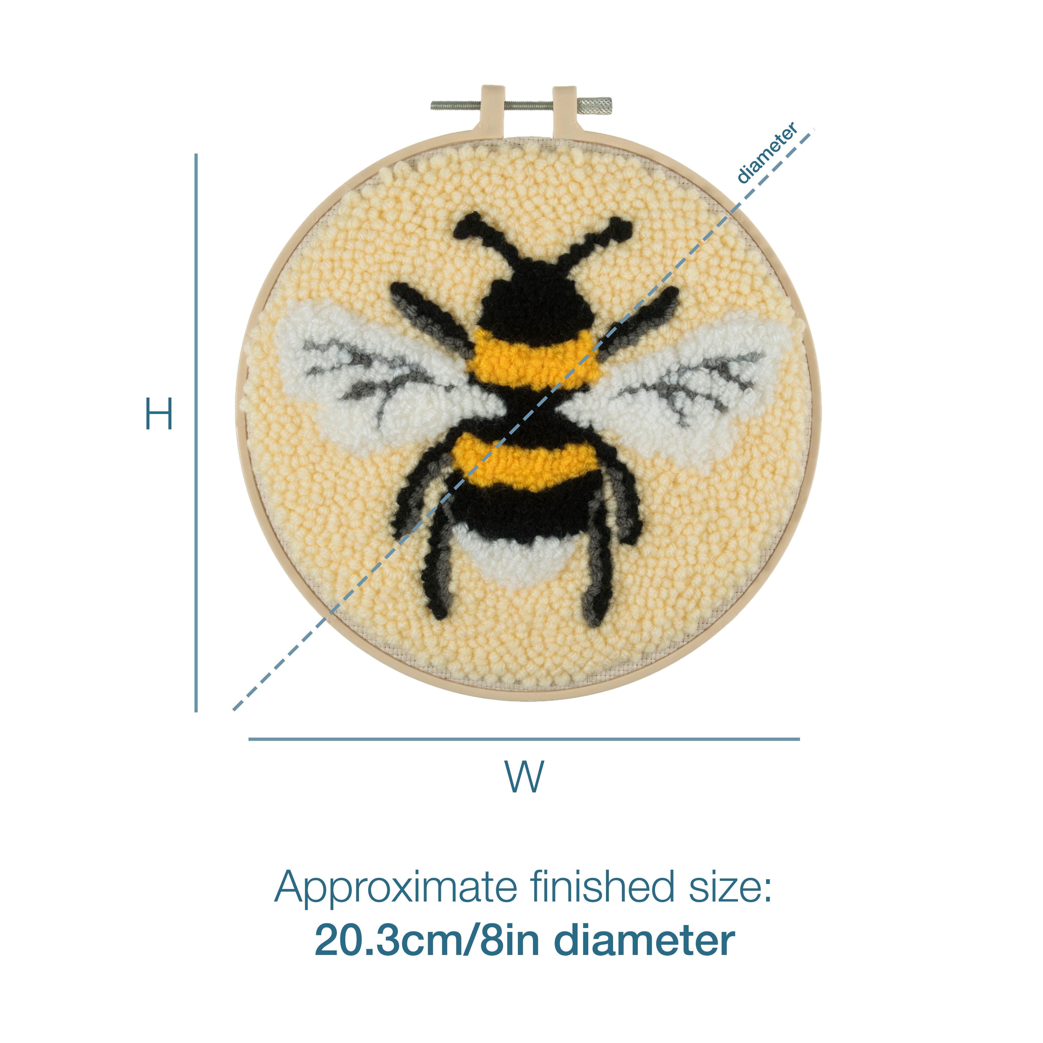 Punch needle kit. These punch needle hoop kits are the perfect introduction to the art of needle punching and would make a perfect home decoration or a unique gift. Kit includes: pre-printed, cotton, 11 count, punch needle fabric; chunky weight, acrylic, 4 ply yarns; punch needle tool; needle threader; plastic non-slip hoop and instructions in 3 languages (EN, FR, GER). Approximate finished size: (diam) 20.3cm.
