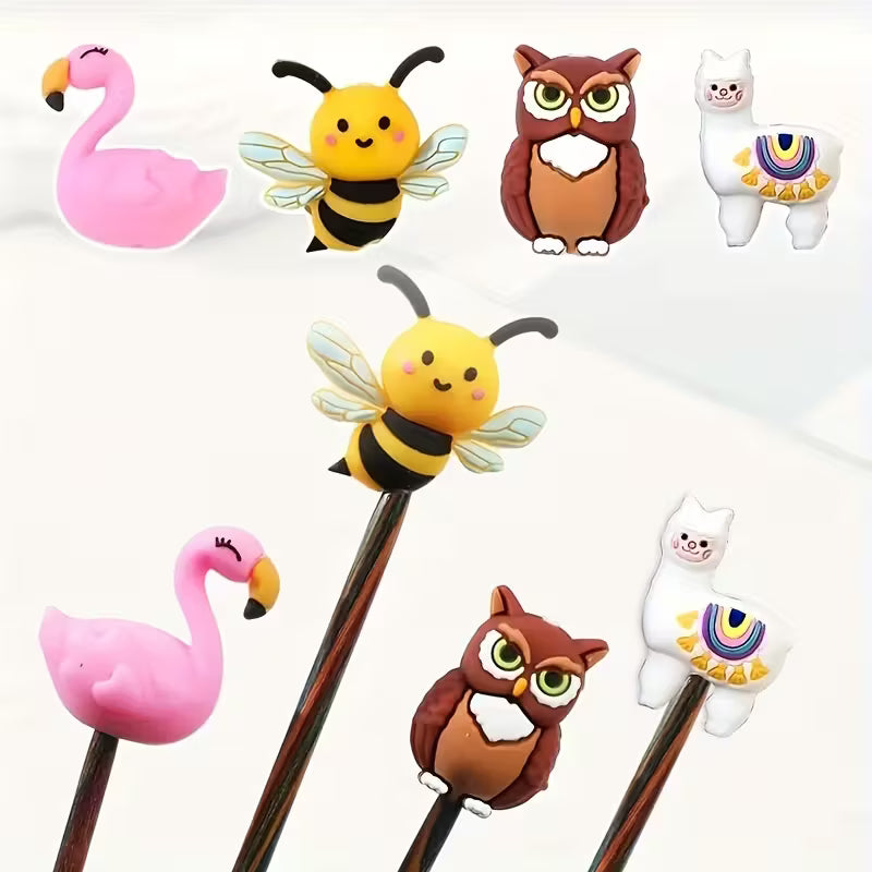 These adorable animal-shaped point protectors fit snugly over needle tips, preventing stitches from slipping off when your work is put down, while also safeguarding the points when they’re not in use.