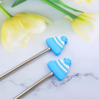 These adorable Blue Hat-shaped point protectors fit snugly over needle tips, preventing stitches from slipping off when your work is put down, while also safeguarding the points when they’re not in use.