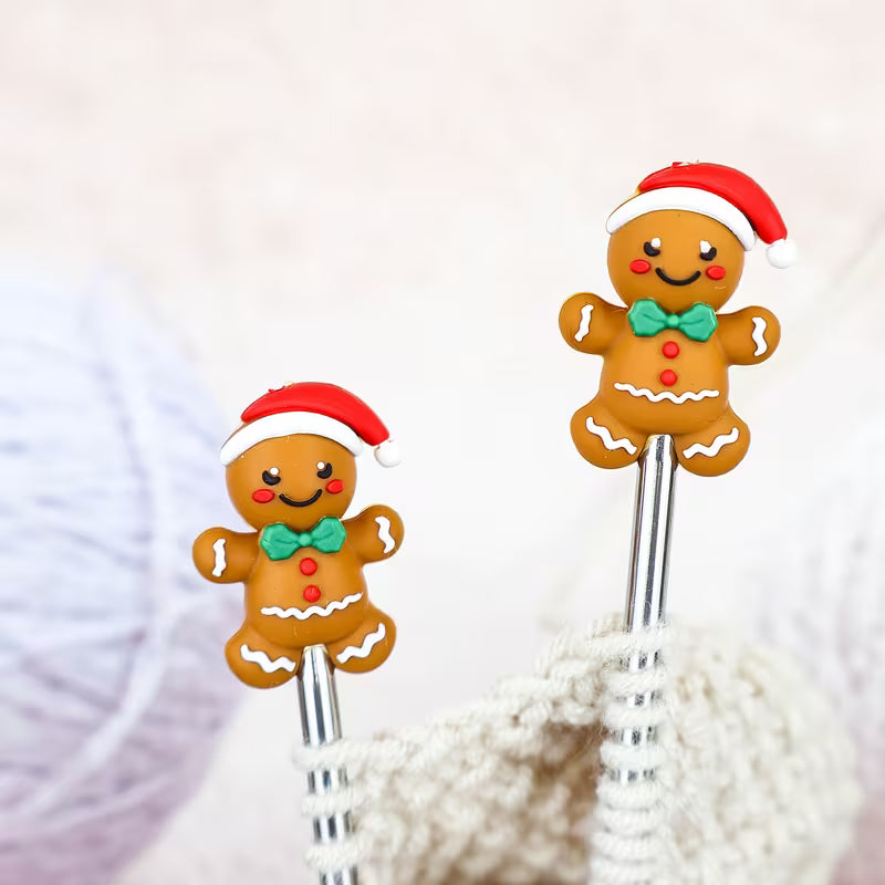 These adorable Gingerbread men-shaped point protectors fit snugly over needle tips, preventing stitches from slipping off when your work is put down, while also safeguarding the points when they’re not in use.