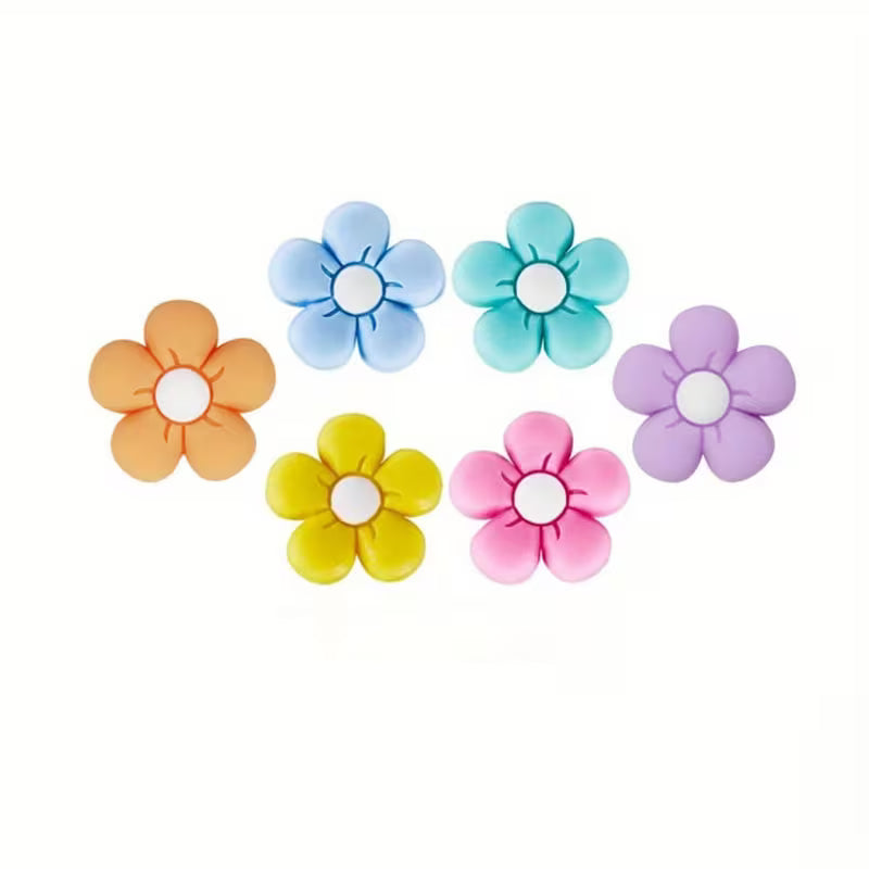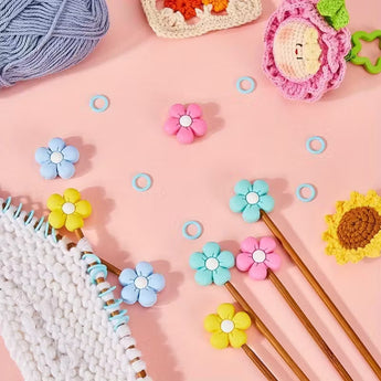 These adorable multicoloured flower-shaped point protectors fit snugly over needle tips, preventing stitches from slipping off when your work is put down, while also safeguarding the points when they’re not in use.