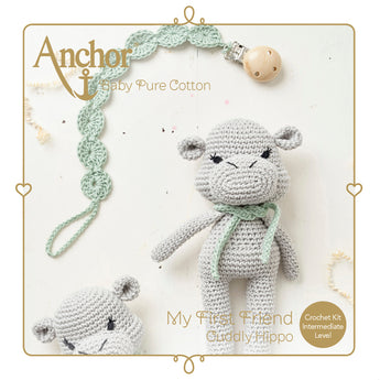 My First Friend - Cuddly Hippo. Baby's soft toy and coordinating dummy strap. Kit includes: 100g Baby Pure Cotton yarn; stranded cotton yarn for eyes and nose; 30g polyester toy filling; booklet with instructions in 9 languages. Extra tools required: (not included) crochet needles (1.75mm and 2.5mm); embroidery needle number 18 and 1 wood/metal clip. Approximate finished size: (h) 21cm. Suitable for medium-skilled crafters. Packaged in recyclable cardboard box.